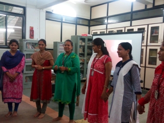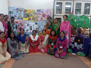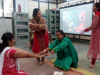 Teaching concepts of languages ( English ) through the medium of stories were presented with the help of slides shown on the screen. Teachers were also encouraged to enact few characters. They enthusiastically participated in it. Use of music and movements for better class control was also highlighted. Ideas were shared about using stories even for teaching subjects like Maths and Science.